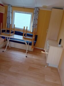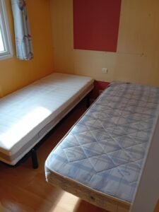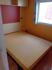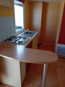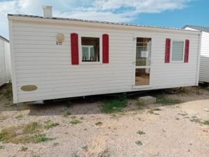 À vendre : Mobil-home de 2 chambres avec salon/séjour, cuisine équipée, salles de bain et WC séparés. Dimensions : 7,70 x 4 m. Année : 2007. Prix : 8000 €.