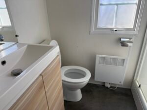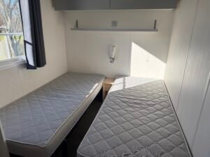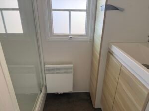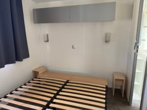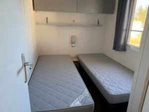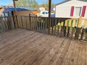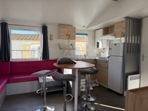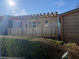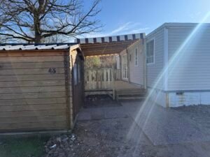À vendre : Mobil-home de 3 chambres avec salon/séjour, cuisine équipée, 2 salles de bain et WC avec terrasse couverte 6 x 3 m, placé sur parcelle. Dimensions 9,90 x 3,95 m, année 2012. Prix : 23000 €.